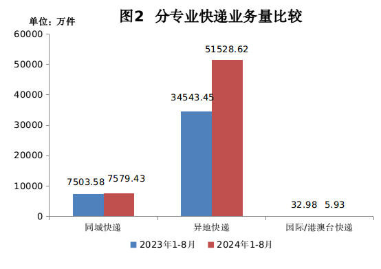 1-8月,同城快递业务量完成7579.43万件,同比增长1.01%;异地快递业务量完成51528.62万件,同比增长49.17%;国际/港澳台快递业务量完成5.93万件,同比下降82.01%。